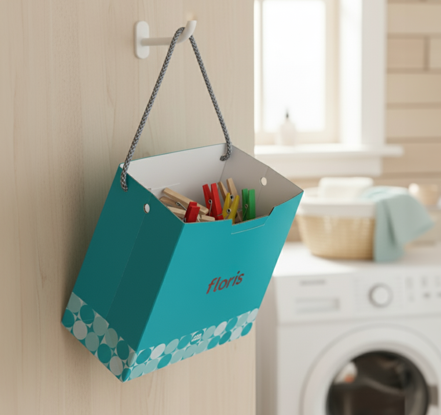Riempila con le mollette: avrai un pratico e sostenibile porta mollette, pronto da trasportare o appendere, riducendo gli sprechi e dando nuova vita alla scatola.