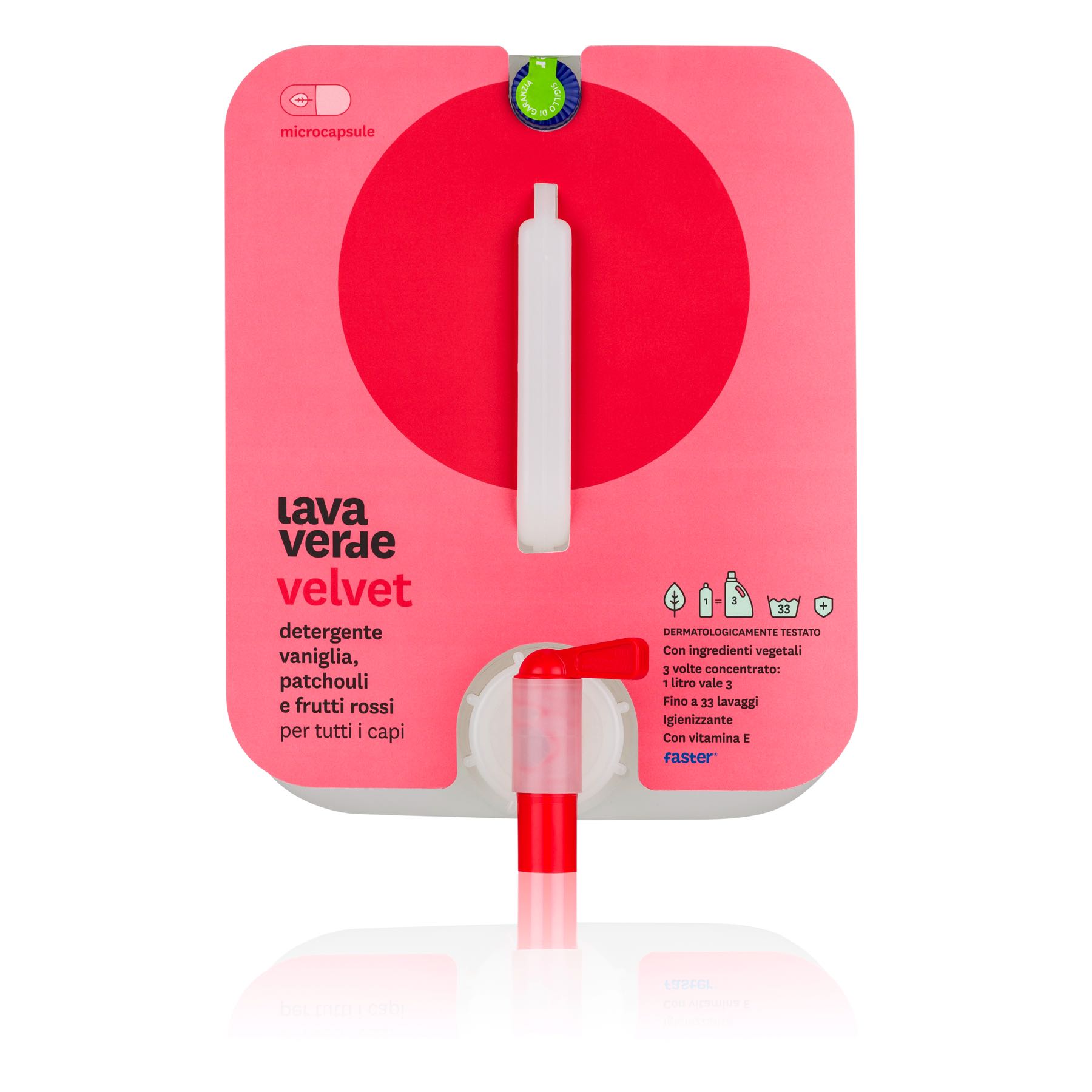 Detergente liquido concentrato alla spina per il lavaggio, a mano o in lavatrice, di tutti i tipi di tessuti. È perfetto per tutti i tipi di tessuti, a mano o in lavatrice, lascia sulle fibre una fragranza inebriante ed intensa. Con solo 30 ml per 5 kg di biancheria dona capi straordinariamente puliti, lasciando un delicato, ma persistente profumo. Il detergente Velvet è arricchito con vitamina E, dalle proprietà antiossidanti, che rimane sui tessuti e agisce in modo benefico sulla pelle.